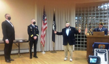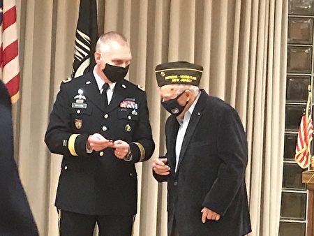 在授勋仪式上,虽然他戴着口罩,他的眼睛眯着、微笑着,他终于收到了他的三枚第二次世界大战作战勋章。