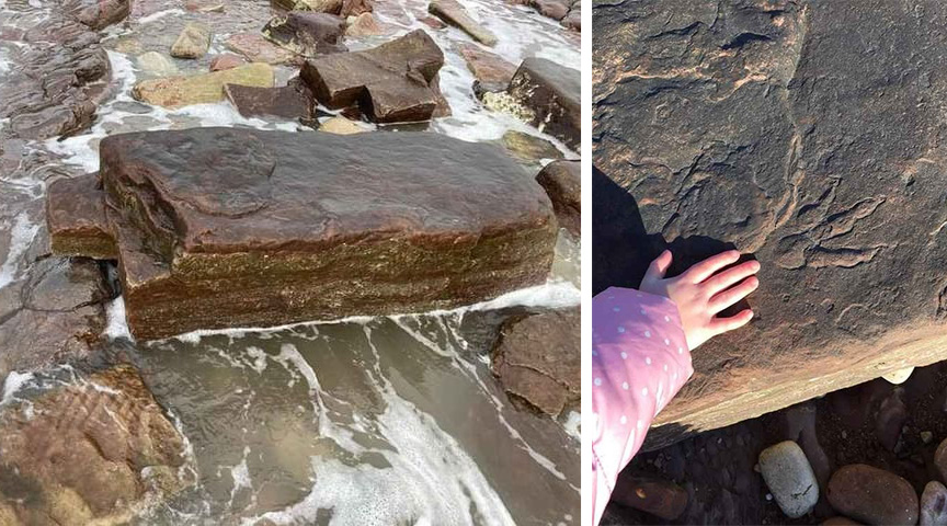 1月下旬,4岁的莉莉·怀尔德(Lily Wilder)与她的父亲带着爱犬沿着南威尔士海滩散步时,在一块跟她肩膀差不多高的岩石上发现了这个恐龙脚印,她兴奋地让父亲来看,父亲也好奇地拍下了照片。
