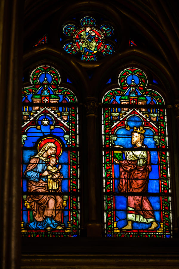 礼拜堂上层只有王室和贵族才可以进入,共有15扇高达15米的彩色玻璃,整体面积达600平方米,巨大的玻璃窗上满是琳琅的色彩和细节丰富的形象,入口中央的门柱上雕刻有耶稣像,门楣上方还有许多惟妙惟肖的宗教人物。西边玫瑰花窗下的绘画,精美绝伦。