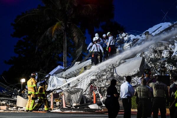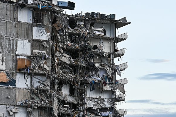 2021年6月24日,迈阿密海滩以北的瑟夫赛德市(Surfside)一栋公寓楼部分倒塌,引发重大应急反应。(Joe Raedle/Getty Images)