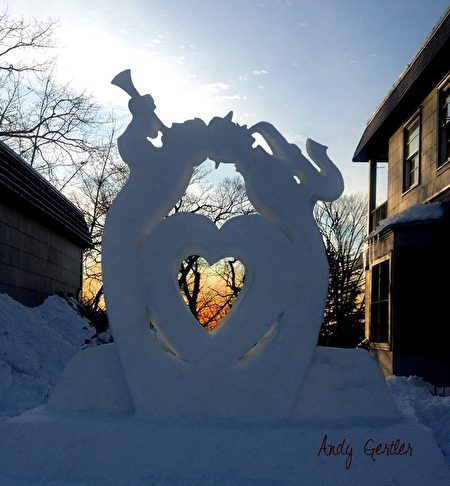 回顾过去的项目,他们回忆起另一个用雪作为原材料的有意义的雕塑。这幅作品是在情人节的暴风雪中创作的,一位爵士萨克斯管手和一位小号手在演奏甜美的音乐时向后倚靠,在他们的身体之间形成了一个心形。