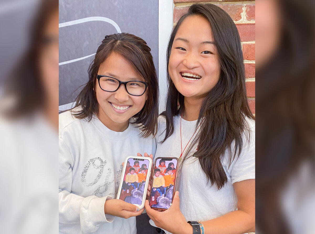 艾莉(左)和露比(右)在手机里找到同一张在济南社会福利院拍的旧照片,而且拍照的时候两人也是比邻而坐。(艾莉和露比提供)