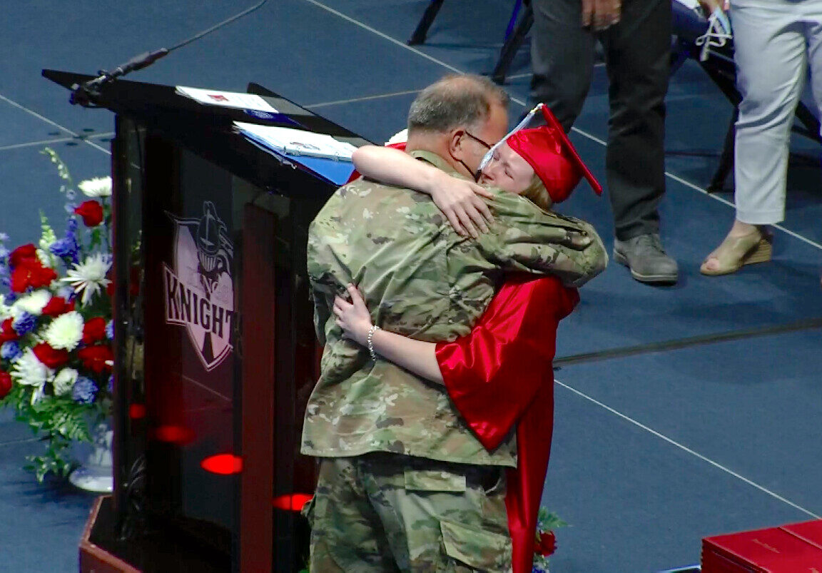 美国俄亥俄州一名女生日前迎来自己的高中毕业典礼,而将近一年没见面、到中东执行任务的军官爸爸突然现身,令她惊喜不已,也让这个特殊的日子更加难忘。
