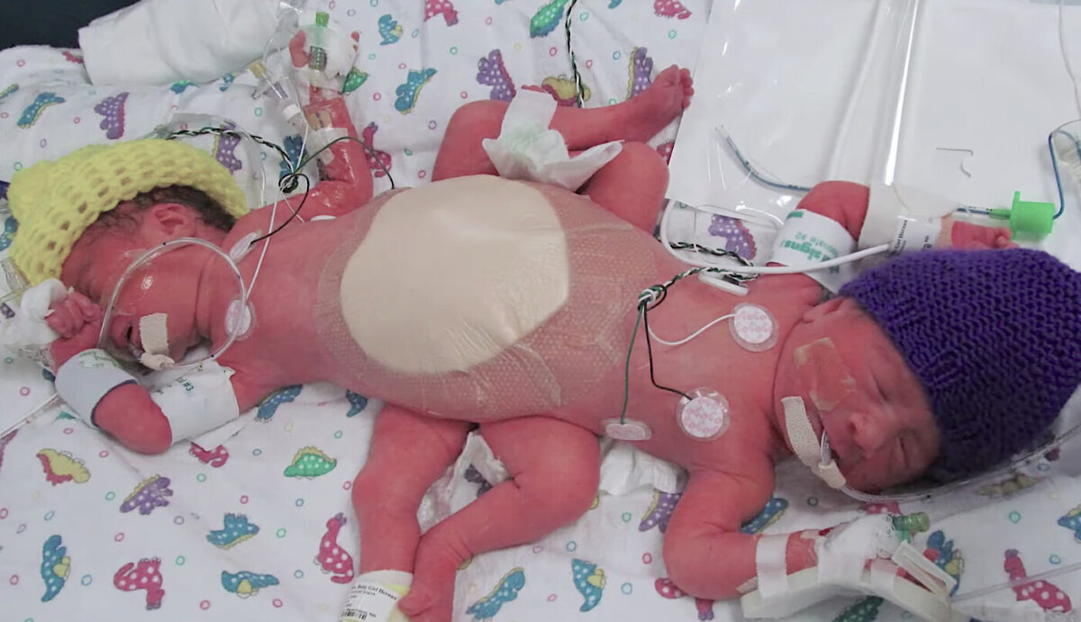这对双胞胎的连体现象非常严重,她们腰骶连体,共用一个骨盆,甚至连结肠和膀胱都是共用的,但各自有单独下肢。据了解,像这种一组三胞胎中出现一对连体婴的概率仅有五千万分之一,非常罕见。