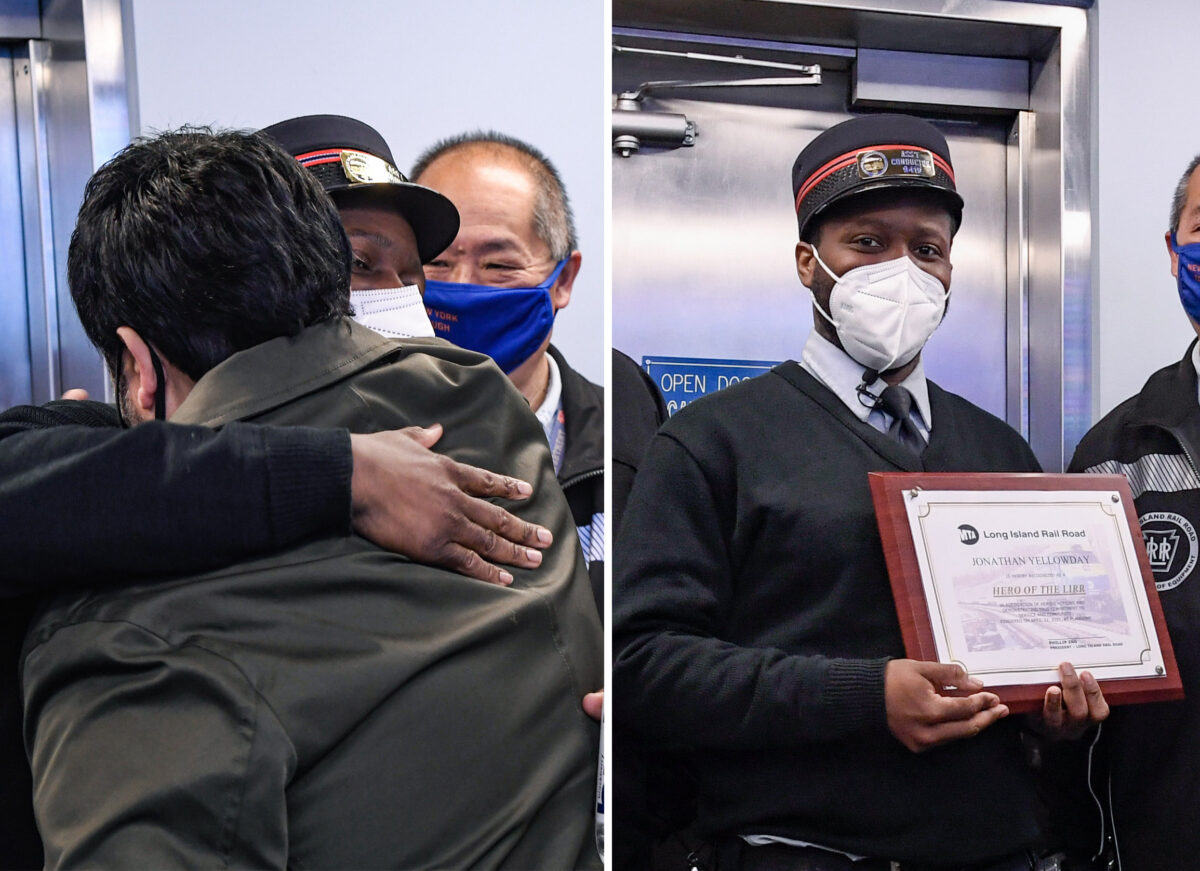 美国纽约长岛铁路(LIRR)的售票员耶洛瓦德(戴帽者)日前在列车上执勤时,捡到一盒价值超过10万美元的珠宝,尽快将其归还给失主,并因此获得了表彰。(Marc A.Hermann / MTA提供)