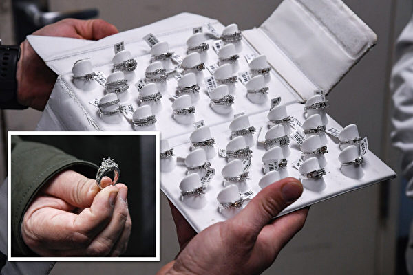 当他打开后,惊奇地发现里面竟装着一整盒订婚戒指,有的还镶嵌着钻石,上面的价签显示这些戒指的价格在2,000美元到7,000美元之间,总价值达10.7万美元。