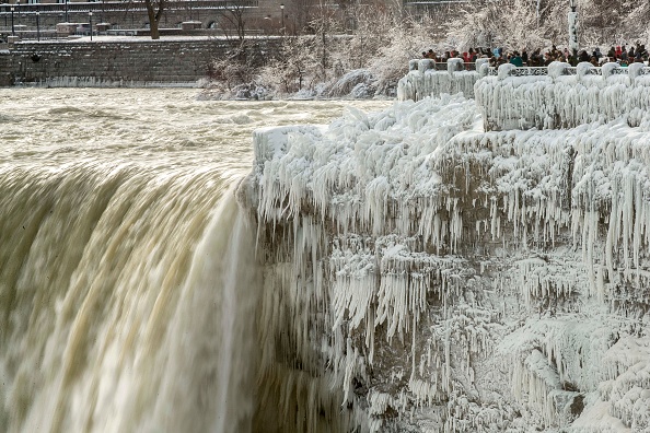 2018年1月3日,尼亚加拉大瀑布出现冰封奇观,吸引民众冒着严寒前来拍摄美景。(AFP PHOTO / Geoff Robins)