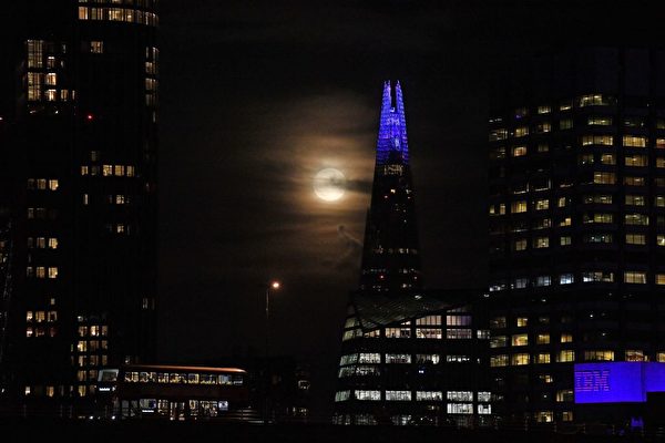 2020年10月1日,满月从伦敦市中心的夏德塔(The Shard)升起。(JUSTIN TALLIS/AFP via Getty Images)