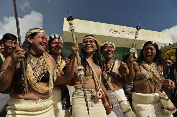 2019年4月16日,诉讼原告、也是“帕斯塔萨省瓦拉尼族组织”主席的Nemonte Nenquimo(中)和瓦拉尼族人一起庆祝告赢政府。(RODRIGO BUENDIA/AFP/Getty Images)