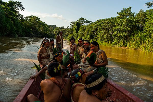 2019年4月,瓦拉尼部落在库拉赖河畔唱歌,反对石油公司侵占雨林。(RODRIGO BUENDIA/AFP/Getty Images)