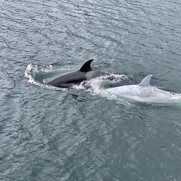 8月7日在观鲸船上看到白鲸之后,更不可思议的是:有一天,罗杰斯在他面朝海滨的家中,在房前的海岸线附近来了一群不太可能出现的“来访者”。他的儿媳妇发现附近有一群虎鲸在游弋,并大喊大叫,果不其然,那只罕见的白色虎鲸鳀游克也出现在鲸群中。