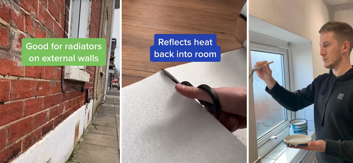 詹姆斯还亲自演示将铝箔纸剪成一定尺寸的矩形,并用双面胶带将它们黏贴在壁挂式散热器后面的墙壁上,以将热量反射回房间。