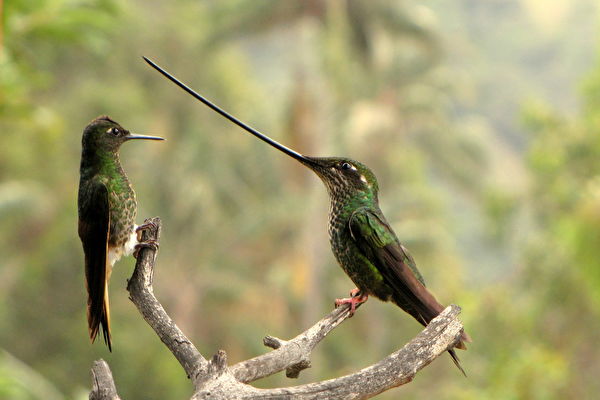 刀嘴蜂鸟体型不大,非常奇特的是,它们的喙比身体还长,大约为10厘米,也是唯一一种喙比身体长的鸟类。据了解,它们的超长喙部,是为了吸食一种西番莲属植物的花蜜而变长的。