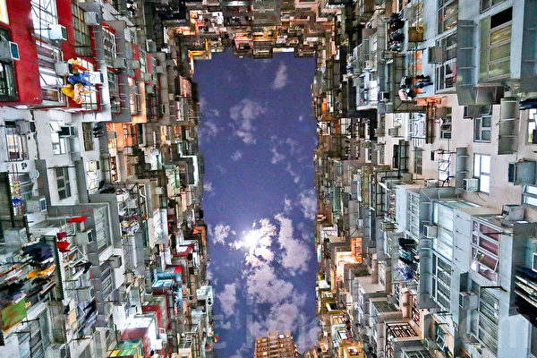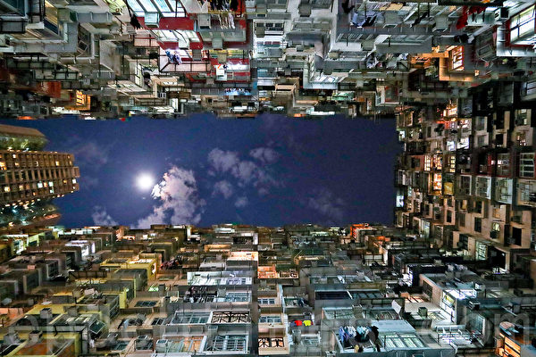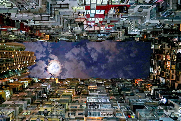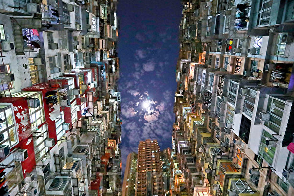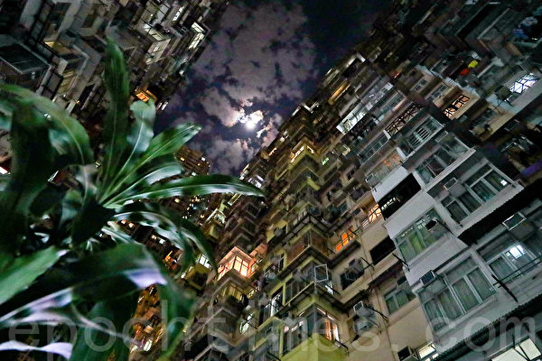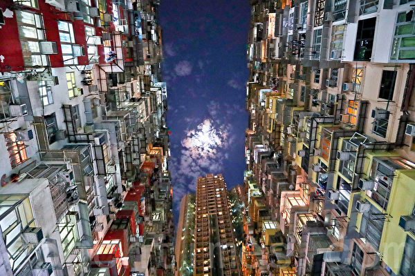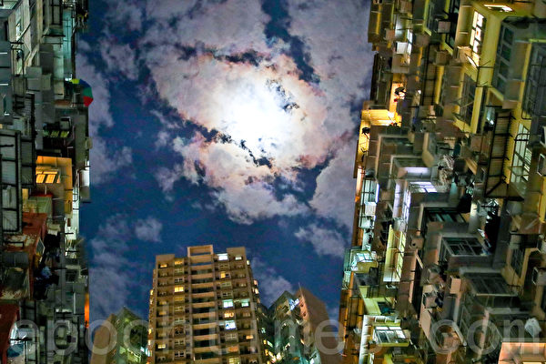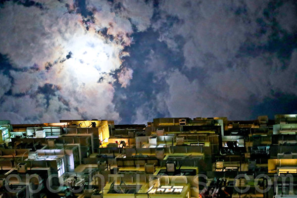 香港稠密高楼群的特殊景观,曾是好莱坞电影变形金钢、攻壳机动队等影片的取景场地之一。图为2017年4月8日晚,香港鲗鱼涌高楼群在明月相伴下,彩云片片的美景。(余钢/媒体)