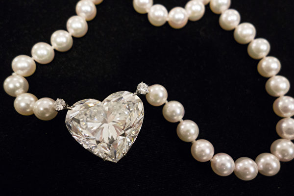 这颗重达92克拉、名为“La Legende”的心形钻石悬挂于一条养殖珍珠项链上。该钻石属于D色钻石,是钻石中的最高等级,而且没有任何瑕疵。