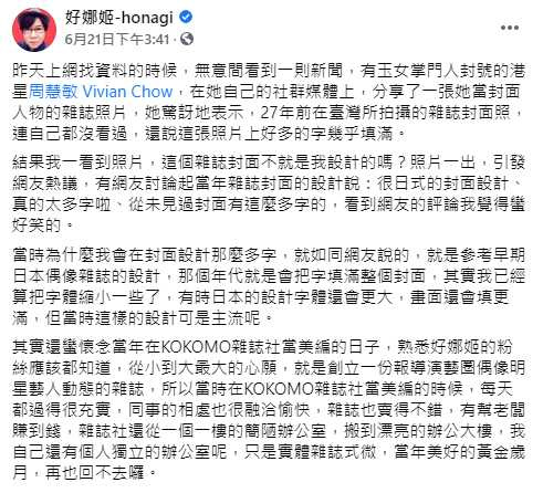 好娜姬21日在脸书透露,「昨天上网找资料的时候,无意间看到一则新闻,有玉女掌门人封号的港星周慧敏Vivian Chow,在她自己的社群媒体上,分享了一张她当封面人物的杂志照片,她惊讶地表示,27年前在台湾所拍摄的杂志封面照,连自己都没看过,还说这张照片上好多的字几乎填满。」