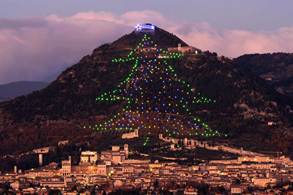 在意大利中部城镇古比奥(Gubbio)的山坡上,由巨型灯饰组成的世界最大圣诞树,每年都会在圣诞节之前点亮,今年也不例外。在过去几十年来,这已经成为当地的传统以及吸引游客造访的亮点之一。