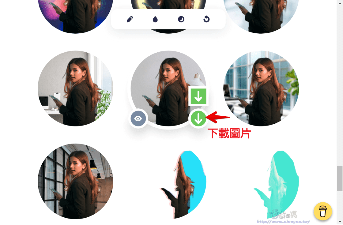 滑鼠移动到头像上方停留会出现预览、下载按钮,点击「下载」即可储存该张图片。 (注:方形下载按钮会储存方形图片。)