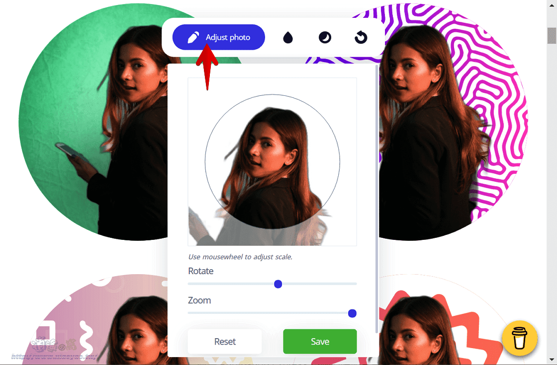 若有需要也能调整主角影像,点击「Adjust photo」可以调整缩放比例和旋转角度,滑鼠拖曳改变位置。