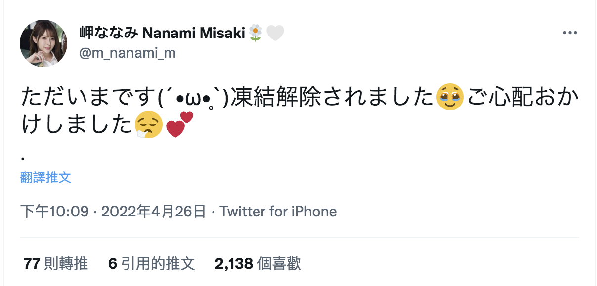 虽说迄今仍旧不晓得是什么具体原因、让超过50 位日本AV 女优的帐号遭冻结,但岂料就在Elon Musk 正式收购Twitter 后,多位人气女优竟陆续“解冻”!其中就包括小宵こなん、miru (坂道みる) 和岬ななみ等人,此举也让网友大赞Elon Musk 到「马斯克,我的超人」「这才是能创造世界和平的男人」「马皇登基,大赦天下!」等话。