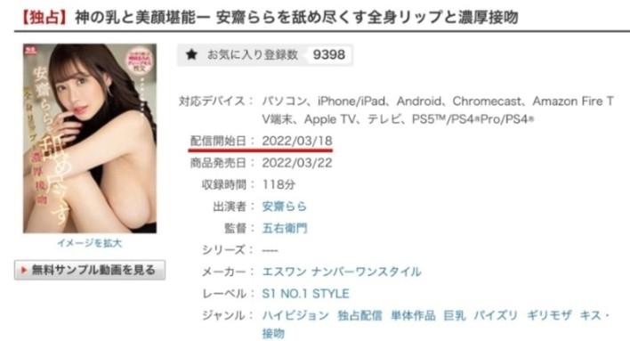 不卖关子了,是安斋らら(安斋拉拉)的作品「神のRと美颜堪能ー安斋ららをCめ尽くす全身リップと浓厚接吻」在串流平台发售两周年的日子,可会有人觉得奇怪,我干嘛特别拿这支番号SSIS-357的片子出来讲?原因很简单,就是: