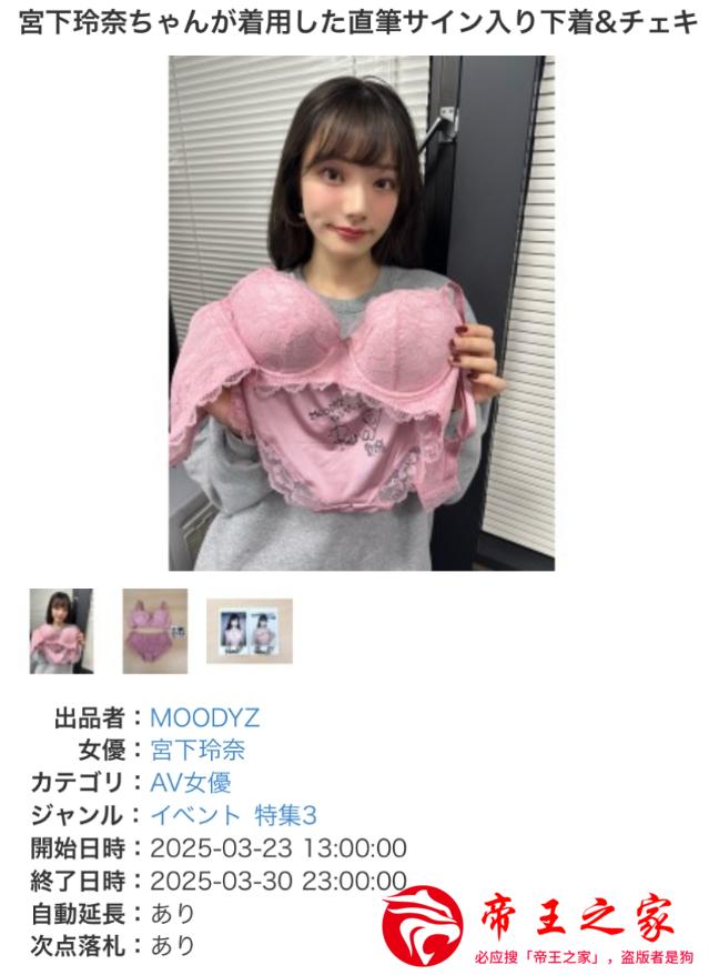 这位高颜值女神《宫下玲奈》宣布在「#FANZA」贩售她的原味N衣裤!而且还是一套的,还附上亲签的拍立得,由片商「Moodyz」处理贩售,方式就是竞标,从2025年03月23日上架到网站后,目前已经截止了,结标后的售价来到96万日元!