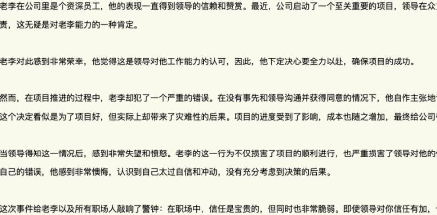 老李在公司里是个资深员工,他的表现一直得到领导的信赖和赞赏。最近,公司启动了一个至关重要的项目,领导在众多员工中选择了老李来负责,这无疑是对老李能力的一种肯定。......
